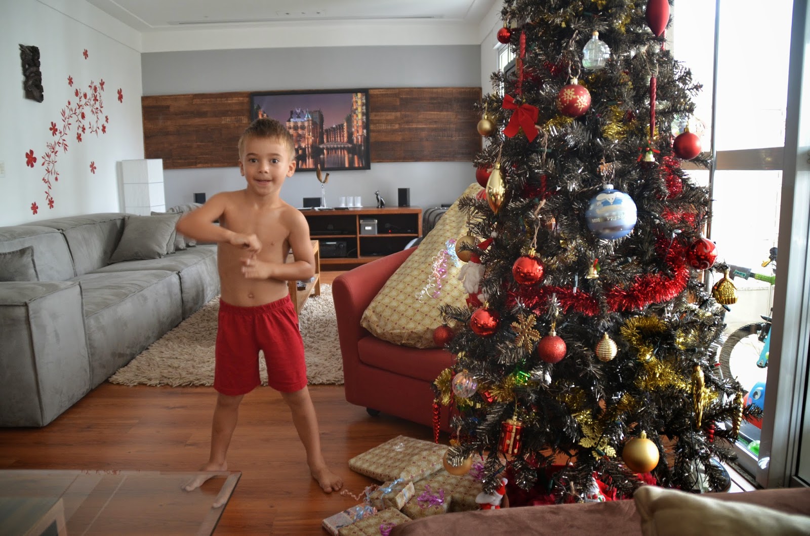 Shopping et Travers de porc Aujourd’hui, Sabryna travaille depuis la maison. Elle va donc essayer de terminer pour midi, et ensuite « les Vacances avec un grand V ». Levés vers 9 heures, Sabryna nous attend pour le petit déjeuner (café et petites gâteries) et repart vite travailler ; nous passons la matinée avec Toan qui nous fait découvrir ses nouveaux jeux, quelques montages de trains avec Papy et enfin et surtout en pleine manipulations et prises de photos (de tout ce qui bouge….ou pas, d’ailleurs) avec l’appareil que nous lui avons offert pour son anniversaire….et qu’il attendait avec impatience ! Pour midi, Neuza nous a préparé une super salade composée (normal la verdure c’est important…comme dirait Domi, cela me poursuit….) accompagnée d’une belle assiette de jambon cru et melon. Une fois le déjeuner pris, nous partons, pour un après midi SHOPPING. Pour cela, nous n’allons pas trop loin et nous dirigeons vers le centre commercial IBIRAPUERA à proximité du parc portant le même nom. Une vaste galerie marchande sur 5 ou 6 étages, de quoi visiter et lécher quelques vitrines. Mais nous sommes en pleine période de Noël, et bien que nous ne le constations pas trop compte tenu de la température extérieure, nous pouvons admirer de très belles et grandes présentations de décorations.