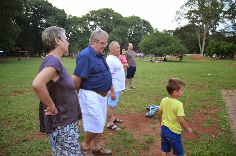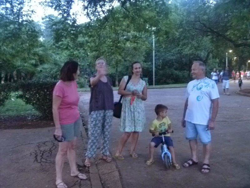 Arrivée des Savoyards Vers 9 heures, nous assistons à l’arrivée de Mamie Didine et Papy André tout frais atterri à l’aéroport. Petit problème il manque une valise qu’ils retrouveront heureusement plus tard. Une deuxième vague de cadeaux du Père Noël, et Toan ajoute un train à son train dans sa chambre… Ce midi, nous allons tous ensembles au restaurant « PRACA SAO LOURENCO » Un agréable moment, dans un espace très ouvert sur un extérieur verdoyant avec une petite marre à poisson rouge et une cabane dans les arbres pour les enfants en général et Toan en particulier. Un buffet à couper le souffle. Mamie Domi et Toan dans la cabane dans l’arbre pour se détendre La sortie du restaurant, nous attendons le voiturier et l’automobile. Cet après midi fût un peu spécial puisque Domi et Sabryna se sont rendues au BUDDHA SPA, pour une séance de massage « CHIATZU » qui apparemment leur à particulièrement convenu. Un pur bonheur en dira Domi ! Sacré Père Noël tout de même ! MERCI Père Noël pour ce beau cadeau ……C’est bon de se retrouver de temps en temps, entre Maman et Fillote et de se faire masser dans un endroit calme et magnifique, au dernier étage d’un immeuble….. sous le ciel Vers 19 heures, nous nous dirigeons vers l’immense parc IBIRAPUERA. Ce soir il doit y avoir un spectacle de lumières sur un des lacs. Le parc d'Ibirapuera est le deuxième plus grand parc de la ville de São Paulo. Véritable poumon vert de la métropole, son importance est comparable à celle du Bois de Boulogne pour Paris, de Hyde Park pour Londres ou de Central Park pour New York. Le parc occupe une superficie de 1 584 km². Ses trois lacs (dont un avec fontaines) occupent à eux seuls une superficie de 157 000 m2. Il a été conçu par Roberto Burle Marx. Ses bâtiments ont été conçu par l'architecte Oscar Niemeyer. Son inauguration a lieu le 21 août 1954, à l'occasion du 400e anniversaire de la ville.Il est de nos jours un lieu important de détente, de conventions, accueille des événements publics et privés, fêtes expositions et concerts. Le nom d'Ibirapuera vient de l'expression en langue tupi pour désigner le « bois pourri ». Un peu de marche dans un parc n’est pas pour nous déplaire et perdre un peu de calories accumulées depuis notre arrivée ne sera pas un luxe ! Nous voila donc nous promenant en traînant tranquillement, admirant ici, quelques arbres énormes et là des Eucalyptus géants. Le spectacle des lumières Un beau spectacle, vu de l’arrière et d’un peu trop loin malheureusement. Vers 21h30 nous rentrons pour dîner, mais ce soir il faut vider le frigidaire, car demain nous partons à 5h30 pour une semaine et à deux voitures, car nous sommes sept et les valises. Direction PARATY dans l’état de Rio de Janeiro à un peu plus de 200 Kms, normalement le trajet devrait durer 4 heures…… nous gardons bon espoir.