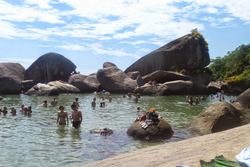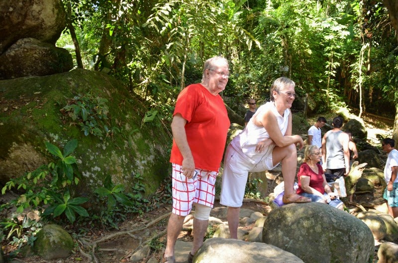de PARATY La veille, nous avions promis à Toan de l’emmener de bon matin voir les crabes dans le petit port au bas de l’immeuble. Nous voilà donc partis, après avoir avalé le petit déjeuner, à la rencontre de ces grosses bêtes. Après avoir constaté que les crabes étaient bien au rendez vous, nous remontons à la maison où nous sommes très attendus pour aller « shoppiner » dans les petites rues de Paraty. Nous voila donc partis, pour le village de PARATY et nous faisons une première halte dans un petit musée retraçant l’épopée de l’or qui a marqué le village Un peu d’histoire : Fondée en 1667, à la suite de la découverte d'or dans les montagnes du Minas Gerais, la ville de Paraty s'enrichit rapidement en devenant le port duquel partent les navires qui transportent l'or vers le Portugal. Pendant deux siècles ce petit port de pêche, dissimulé au fond de sa baie, fut le point d'embarquement des armadas de galions chargés de convoyer les richesses du Brésil vers Lisbonne. Cette belle ville fut alors construite dans le plus pur style colonial avec une église à l'architecture baroque. C'était une ville secrète où vivaient des soldats, des flibustiers et des esclaves. Lorsqu'il fut décidé que la route de l'or passerait par Rio de Janeiro et non plus par Paraty, le port fut alors quasiment abandonné par sa population. Pour cette raison, l'architecture de la ville n'a presque pas changé depuis cette époque, ce qui lui confère un intérêt culturel et touristique majeur. Jusque dans les années 1950 il n'y avait même plus de route pour y accéder. Sur le plan touristique, Paraty bénéficie d'un autre atout majeur : la beauté de la nature qui l'entoure. Paraty est en effet logée dans un paysage de collines verdoyantes qui plongent dans la mer pour rejaillir sous forme d'un grand nombre de petites îles, ce qui en fait un petit coin de paradis. Les deux routes de l’or descendant des montagnes ll fait très, très chaud et Toan le sait..... Voila pour le mini musée et la représentation en miniature, de l’histoire de l’or et de Paraty. Nous allons maintenant musarder dans le village à la rencontre des commerçants et de quelques spécialités du pays. Difficile de marcher dans ce village, les rues sont entièrement pavées de grosses pierres complètement inégales, de quoi se tordre les chevilles à tous les pas. Donc le regard reste braqué sur les pieds, et si on veut regarder les boutiques il est plus prudent de le faire à l’arrêt. Il faut dire que les rues sont nettoyées tous les jours à l’eau salée par les marées. Le Village de PARATY et son église. Le soir de retour à la maison, nous faisons bien volontiers un saut dans la piscine de la résidence. Compte tenu de la chaleur de la journée à Paraty, nous ne pouvons qu’apprécier la fraîcheur toute relative de l’eau douce à presque 30 degrés toute de même. Et les absents ont bien tort…… De belles fleurs, devant notre porte Le soir, petit whisky tradition pour Domi et Michou, bière pour Loïc et jus de fruit pour les autres. Ça bouge à la cuisine, la préparation de la salade traditionnelle et obligatoire avec concombres, tomates et oignons ne se fait pas attendre.... Humour !!! Nous sommes prévenus que demain matin nous aurons un peu de crapahutage à flanc de montagne pour atteindre des piscines naturelles d'eau de mer, un espace protégé dans la baie de Paraty. Nous allons donc nous préparer au frais dans notre chambre, avec la climatisation.