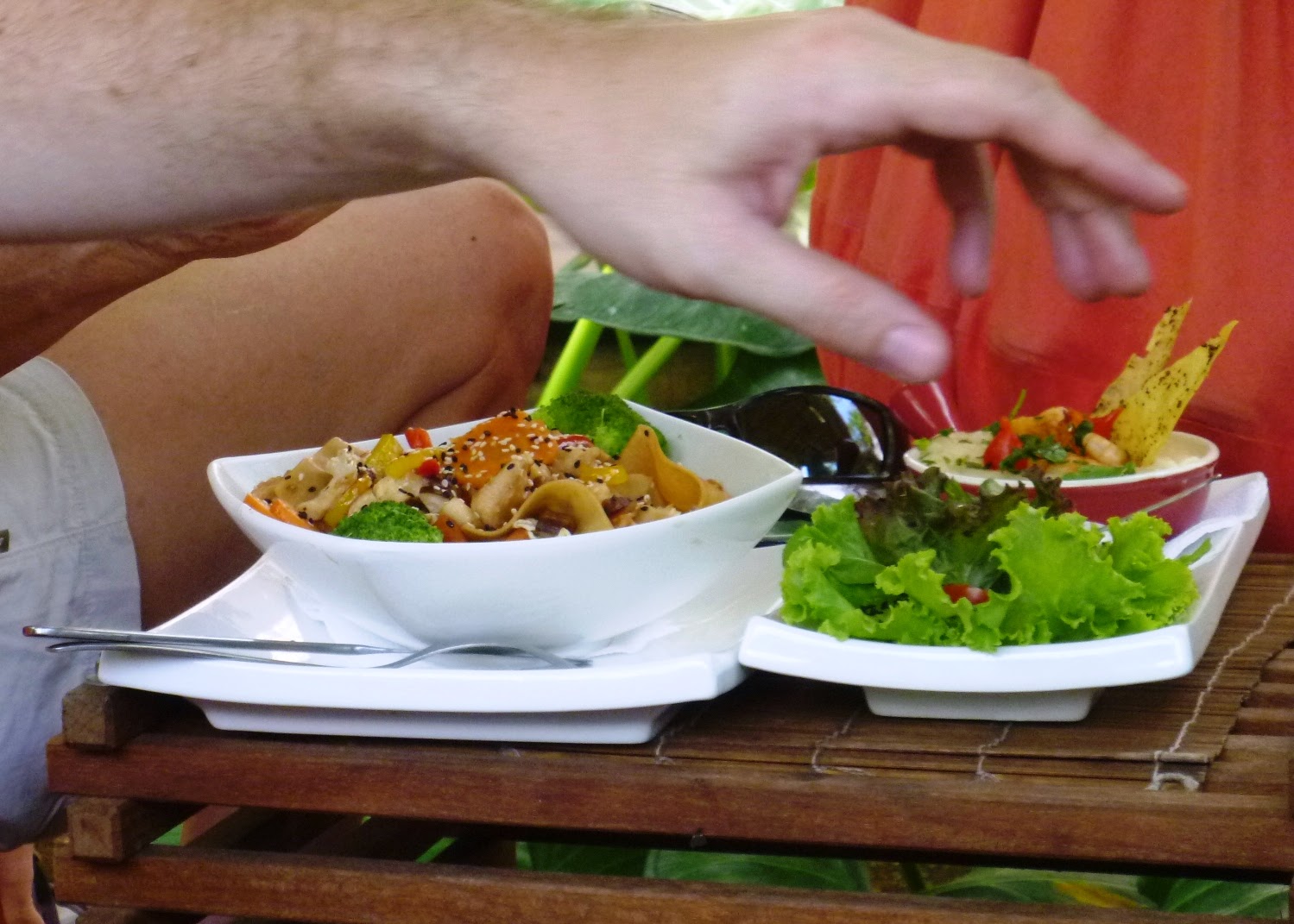 Superbe journée aux cascades Au réveil, Domi et moi allons prendre une grande tasse de café au petit restaurant du port car tout était prévu pour le petit déjeuner à la maison, sauf ….les filtres à café. Cela nous a permis un bon réveil au soleil matinal dans le calme du resto de plage où nous étions tous seuls, et d’apprécier le bord de l’eau au son des cigales. Nous partons ensuite visiter des cascades dans la densité de la forêt avec un peu d’effort de marche pour arriver dans un vrai paradis. Ensuite nous avons rejoint les voitures pour nous rendre pas très loin dans un espace restaurant des plus merveilleux et en pleine forêt.