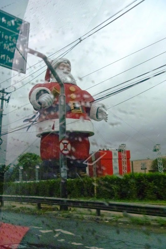 Adieu PARATY – Retour à SAO PAULO Le petit déjeuner est une formalité agréable et le chargement des valises dans les voitures est rapidement effectué. Un dernier coup de balai à l’appartement et nous démarrons vers 9h15 direction SAO PAULO. De façon à éviter les bouchons de l’aller ou nous avions mis 8 heures, Sabryna et Loïc décident d’emprunter une autre route qui pourrait éventuellement être plus rapide. En route donc, et sous une grosse pluie. Nous roulons tranquilles durant quelques kilomètres, mais les brésiliens sont tenaces… ils aiment bien les bouchons, et nous voila rentrés à nouveau dans un énorme ralentissement. En route et compte tenu de la vitesse du roulage, nous avons le temps de nous arrêter, pour acheter un petit régime de banane à 5 Euros (pas cher la banane) sans causer le moindre bouchon supplémentaire. Entre deux averses, Domi descend même de la voiture pour griller une cigarette en marchant à coté de nous. Nous prenons notre mal en patience…. (Que faire d’autre), et nous nous arrêtons dans un restaurant genre routier avec un grand buffet, pour casser une petite croûte. Excellent pour un restaurant de bord de route, et cela nous aura coupé un peu la morosité du bouchon. Seul Loïc n'à pas profité de ce repas !! Ensuite vers les 15 heures, le ralentissement commence à battre de l’aile, nous pouvons donc rouler à une vitesse plus normale et nous entrons enfin dans Sao Paulo où nous apercevons le gigantesque Père Noël. Il est 17h 45. Rapide calcul…. Nous avons mis plus de 8 heures au lieu des 4 prévues. Encore un très bon record. et dire que nous pestons dans un bouchon de 10 minutes sur la rocade toulousaine.....Nous montons rapidement les valises, et partons nous sustenter à pieds (les bouchons c’est terminé) dans un superbe et excellent restaurant mexicain