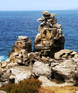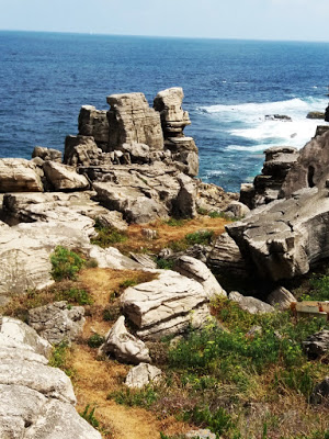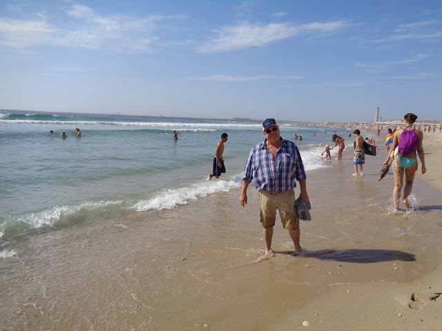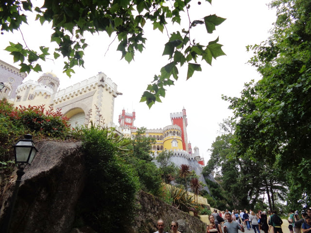 spécialité de la ville à base de liqueur de griotte. Il n'y a pas de meilleur exemple de ville traditionnelle portugaise que Obidos. La liqueur de Ginja (griotte) servie dans des coupelles en chocolat. Dès notre arrivée, et le voyage nous ayant creusé un peu l'estomac, nous partons a la recherche d'un petit resto au fil des rues, tranquille et surtout à l'ombre, car il doit au moins faire.... pffffff, 70 degrés. Bien évidemment, nous trouvons le resto idéal près de l'ancien Aqueduc, avec sa petite terrasse bien ombragée ou on sert des morceaux de porc cuit dans la graisse et des poulpes grillés avec des petites patates sautées. Avec un bon 50 cl de Super Bock, que chercher de plus... Bon, bien, d'accord !!!!! nous avons laissé le régime au garage pour quelques jours L'Effet SUPER BOCK Ensuite c'est sous une chaleur torride que nous faisons (avec la clim) le reste de chemin qui doit nous amener à Sintra, pour prendre possession de notre appartement/hotel (enfin bon on ne va pas y revenir) SINTRA Après avoir pris nos marques, et posé les valises, nous prenons un petit apéro sur la "terrasse" c'est à dire devant la porte, avant d'aller passer au choses sérieuses du soir : Le repas dans le centre historique. Toujours avec l'aide de notre ami Tripadvisor, nous avions choisi un des meilleurs restaurants et bien noté de Sintra. Nous l'avons bien trouvé.... Mais il était...... Ferméééééééé et définitivement. Encore merci (TripAdvisor, t'as un gros problème).... Bref, nous partons donc à la recherche d'un autre resto et ce n'est pas ce qui manque dans le centre historique de Sintra. Après consultation des menus , nous jetons notre dévolu sur une TAVERNA : belle réception, sur une petite terrasse, la picanha excellente, un bon vin du Dao, et quelques bougies pour la soirée. Après le repas nous trainons un peu à la fraiche sur la place du Palacio de Sintra et de ces deux curieuses cheminées. Très probablement construit sur les fondations de la résidence des chefs musulmans, lors de l'invasion de la péninsule Ibérique vers 700. Il fut le palais des rois portugais dès l'époque de la Reconquête chrétienne du VIII° siècle. C'est cependant à Don João I (1356-1433) et à Manuel Ier (1469-1521) que l'on doit les grands travaux qui ont donné au palais l'aspect général qu'il présente aujourd'hui. Ébranlé par le grand tremblement de terre de 1755, il fut aussitôt reconstruit « à l'ancienne ». Devenu musée en 1940, le palais a gardé une partie du mobilier du temps des derniers rois. Le lendemain, nous partirons à l’assaut du Palais da Pena. PALACIO DA PANA Le Palais de Pena est situé sur l’une des cimes de la Serra de Sintra, au cœur d’un magnifique parc de 200 hectares. Il se caractérise par ses couleurs vives, jaune et rouge. On le doit au prince Ferdinand de Saxe-Cobourg-Gotha, (régent du royaume), d’origine allemande et portugais d’adoption à la suite de son alliance avec la reine Maria II. En 1839, après avoir racheté les ruines d’un monastère hiéronymite du XVe siècle, ce même souverain confie l’édification de son palais d’été au baron Ludwig von Eschwege. Celui-ci mélange allègrement les styles architecturaux (mauresque, baroque, gothique, renaissance et manuélin) afin de livrer un bâtiment exubérant et haut en couleurs, mais qui conserve toutefois quelques parties de l’ancien monastère. La construction, commencée au milieu du XIX° siècle, ne s’achève qu’en 1885, année de la mort du roi. Après la proclamation de la République, en 1910, l’édifice, devenu propriété de l’État, est conservé tel quel et ouvert au public. On pénètre dans le palais par une porte mauresque menant à une cour intérieure ; dans celle-ci, on peut trouver un arc de triton, décoré de détails néo-manuélins. Si le temps le permet, les différents balcons offrent des vues panoramiques sur la côte Atlantique et le Tage. Pour ne pas se perdre, nous suivons le bus qui monte jusqu'à l'entrée du parc. Nous prenons les billets (au tarif réduit pour les séniors) et la navette qui va nous transporter au palais. D'énormes Fougères Une Super bock et un petit sandwich vers 13 heures Nous n'avons malheureusement pas eu le temps de visiter les intérieurs. Une petite promenade dans le parc, et il faut redescendre de la montagne par la même route tortueuse à travers une forêt très dense. Au passage nous avons une superbe vue sur le Château des Maures, ou n'irons pas car il faut marcher plus d'une heure et sous le soleil. Par contre nous aurons la chance de le voir illuminé le soir en allant diner toujours dans le centre de Sintra. Avant le diner, nous avons le temps de partir sur le bord de l'Océan voir un petit village typique. AZENHAS DO MAR Un joli petit village, accroché à la falaise avec une petite plage et une piscine Océanique qui se rempli d'eau salée lors de chaque marée. Cette plage reste assez méconnue des touristes car elle est presque invisible de la route. Sur le retour vers Sintra, nous nous sommes arrêtés dans une petite pastelaria sympa pour se rafraichir un peu le gosier, et qui offre en même temps aux passants, des tables extérieures ombragées et des barbecues pour faire sa propre dinette. C'est bon à savoir. Pour rentrer à Aveiro nous avions convenus de faire la visite de Péniche et de Nazaré. Donc notre premier arrêt fut le Cabo Carvoeiro situé au bout du bout de la presqu'ile de Péniche. PENICHE La péninsule de Péniche est assez particulière sur le plan climatique, car elle est entourée par l'Océan au Nord à l'Ouest et au sud ce qui en fait la partie la plus fraiche du Pays en été. On est aussi surpris par la diversité des falaises fortement érodées. C'est un domaine préservé d'une belle importance géologique, et par temps clair nous apercevons au loin l'archipel des Berlengas. Au loin L'Archipel des Berlengas (en portugais Arquipélago das Berlengas