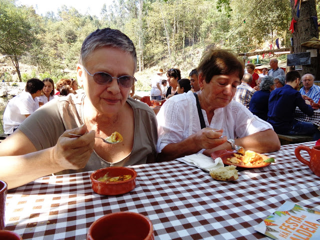 Ami Ami avec le meunier qui nous donne quelques explications L'heure du repas approchant nous faisons un tour des restaurants de la place qui proposent chacun leur spécialité, et José nous fait le choix d'un "Vitela ao forno com batatas e arroz", soit, des morceaux de veau avec patates et riz cuit au four à bois..... tout bonnement excellent, à se manger les doigts !! En attendant le plat, nous nous sommes désaltérés avec une bonne super bock et un bon verre de sangria. Nous avons bien sur accompagné le veau, avec un excellent vin de la région. Bon, ben à par ça... tout va pour le mieux et après un petit dessert, nous sommes allés prendre un café ou nous à rejoint l'Ami Carlos, vous savez, c'est lui qui organise les voyages auxquels nous participons, dont celui du week-end prochain pour 3 jours dans l'Algarve au sud du Portugal ! Crème renversée et pudding au pain et au miel Les tables sous les arbres et au bord de la rivière Le café et "um fino" avec l'Ami Carlos