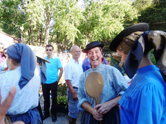 Deux jours de fêtes à UL, UL est un charmant petit village faisant parti de la commune d'Oliveira de Azemeis. Pour nous, tous les ans cette fête du pain du mois de septembre est devenu un rituel. En effet, c'est la troisième année que nous y participons, avec nos Amis José et Florinda. Dès l'arrivée, nous sommes tout de suite plongés dans l'ambiance festive. Après un rapide coup d’œil sur le Moinho de Agua (Moulin à eau), vu d'en haut car pour y descendre (à pied les automobiles étant interdites sur le site) il faut freiner dans une cote à plus de 30% toute en pavés, qu'il faudra bien sur remonter, nous entamons la visite rapide des six meules muent pas l'eau, qui font la farine de blé, d'avoine ou de mais, qui servira à faire le bon pain que nous allons manger. La descente vers le moulin Les petits artisans installés au bord de la rivière Le Moinho de Agua La rivière bien rafraichissante et poissonneuse,qui descend des montagnes et fait tourner les meules du moulin. Un boulanger qui fait le pain sur place C'est traditionnellement la Fête du Pain (Feira do Pão) et l'occasion de visiter le moulin à eau, toujours en fonctionnement aujourd'hui, et bien sur de déguster de bon petits plats accompagnés de bonne sangria, bière et bons vins, assis sous les arbres au bord de la rivière en attendant le déroulement des spectacles de danse des troupes folkloriques. Le pain fabriqué et cuit sur place dans de vrais fours à bois, par les boulangères assidues, est tout simplement excellent. Les meules en action En vidéo