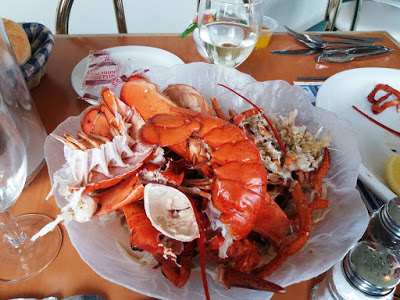 En fait nous traversons le Magasin de la poissonnerie pour aller dans une salle de restaurant à l'arrière, au bord du St Laurent ou nous commandons deux Homards et une bouteille de vin blanc allemand, car il n’avait plus de riesling. Et nous ne le regrettons pas.
