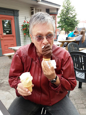 Dans l'après midi, nous nous asseyons sur une petite place au cœur du village pour se régaler d'une spécialité de glace au chocolat et au sirop d'érable.
